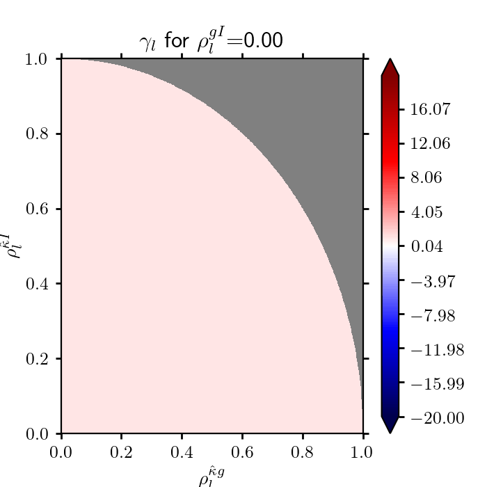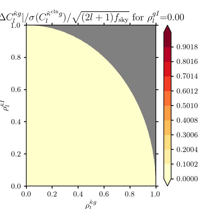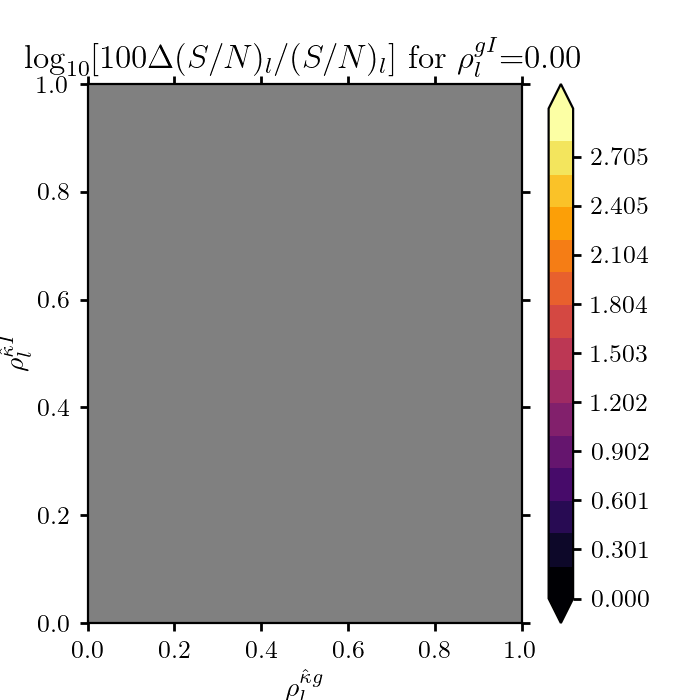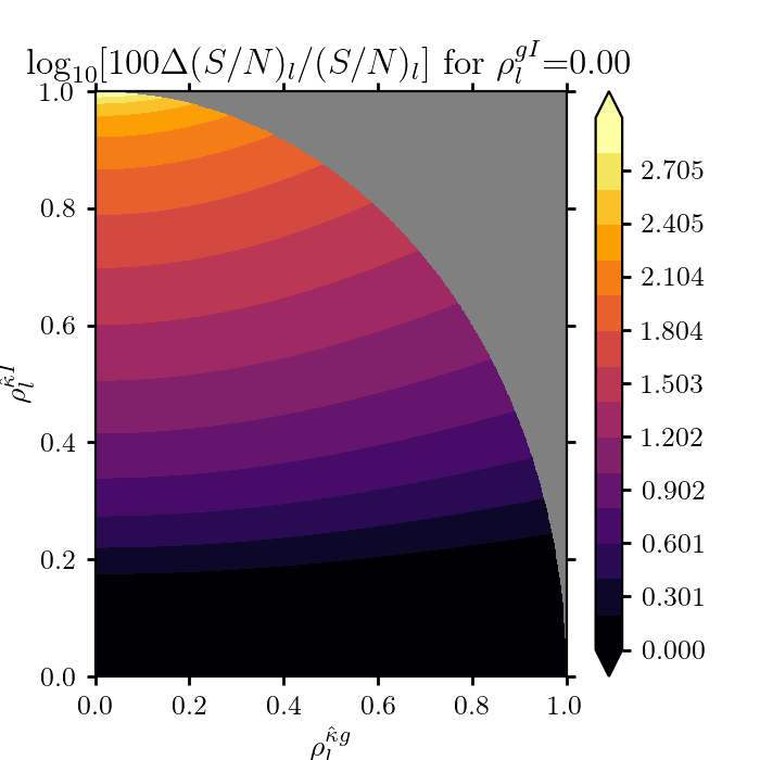 The sign of gamma identifies regions where variance cancellation can (in theory) lead to improved S/N. We can also visualize gamma itself. The ideal gain in S/N might often not be all that desirable in practice if the bias from signal suppression is large compared to the statistical uncertainty after cleaning (this can be assessed from the ratio of bias to noise after cleaning). We can mitigate this bias by, for example, restoring the signal based on measurements of the g-I correlation but only to the point where the mean-squared-error (MSE) is minimized. The fractional gain in S/N at the MSE optimum is shown here for the case where cleaning and signal-correction are both performed on the same patch (fsky=0.03, l=100). Prospects are significantly improved when the g-I spectrum can be measured on a larger patch: for example, here is the gain in S/N when the patch where g-I is measured has fsky=0.8 and the cleaning patch still has fsky=0.03 (still for l=100).